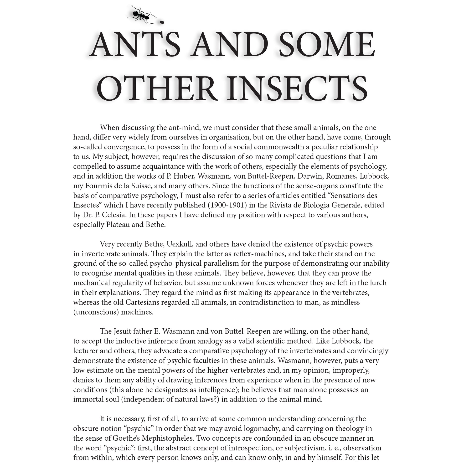 "All the properties of the human mind may be derived from the properties of the animal mind. And all the mental attributes of the higher animals may be derived from those of the lower animals."- Dr. August Forel (1904)Ants and other insects have more in common with humanity than most people suspect. The psychic powers of these creatures are often surprising, and Dr. Forel describes multiple experiments revealing both the psychic and sensory abilities of ants, bees, and wasps, among others. If you have ever been curious about the tiny minds crawling between your feet and building marvelous, city-sized structures (by their standards), then Ants and Some Other Insects: An Inquiry Into The Psychic Powers of These Animals is a must read text and testament to the abilities of these tiny, amazing creatures who share our world.